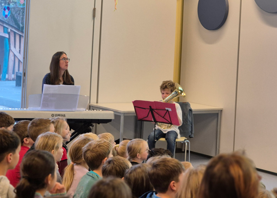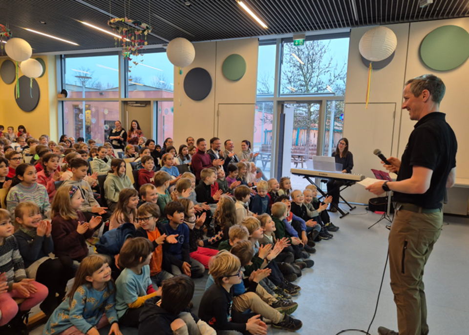 Der feierliche Empfang am 26. November 2024 begann mit musikalischen Beiträgen der 4. Klassen der DUALINGO-Schule. Die SchülerInnen gaben zwei Lieder zum Besten, darunter eine umgedichtete Variante von Mozarts „Eine kleine Nachtmusik“. Ein besonderer Moment war das Hornsolo eines Schülers, der die Europahymne darbot.