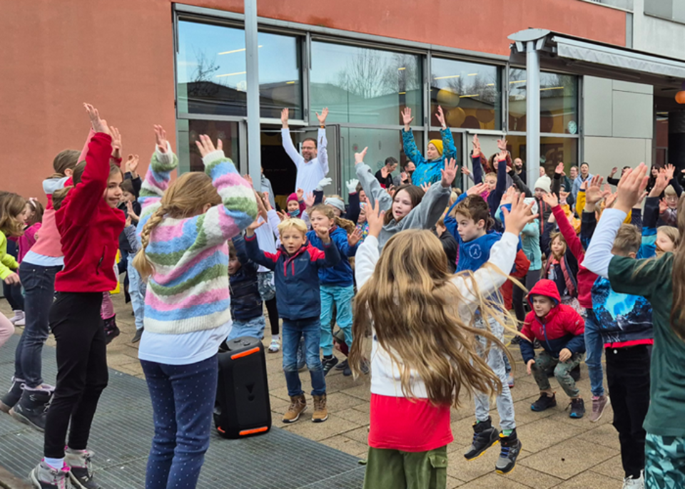 Im Anschluss stand Bewegung im Mittelpunkt: Auf dem Pausenhof nahmen alle SchülerInnen, Lehrkräfte und Gäste an einer sportlichen Frühgymnastik teil – angeleitet von der Schulgemeinschaft. Auch der Oberbürgermeister und der Ortsteilbürgermeister ließen es sich nicht nehmen, an den Übungen mitzuwirken.