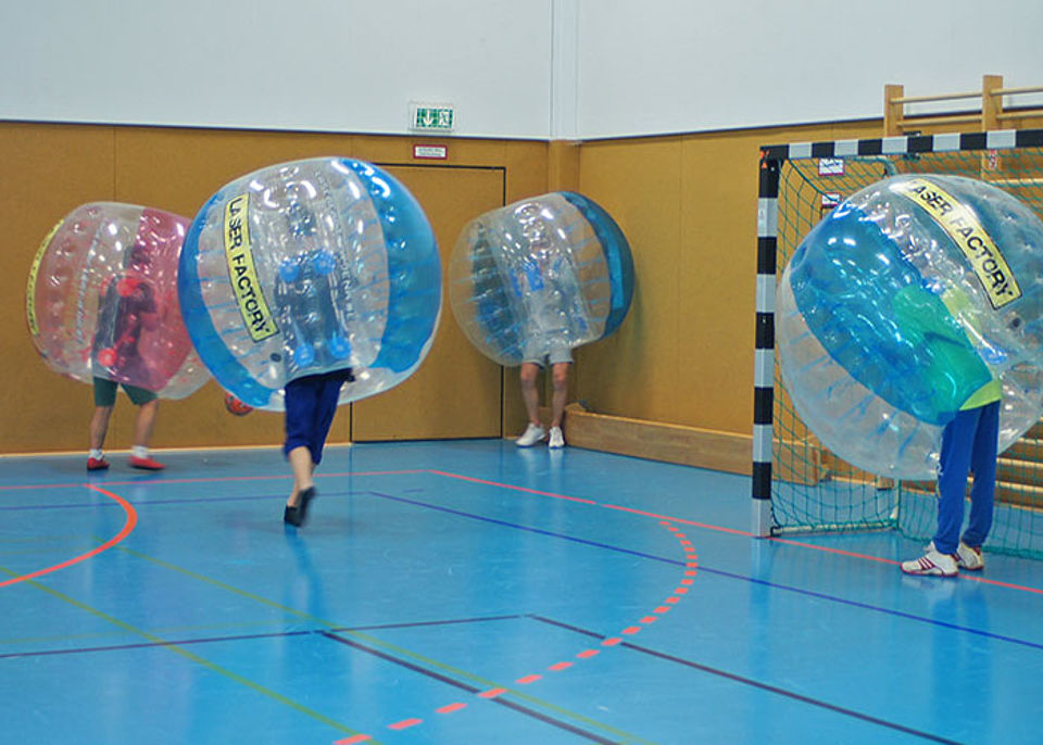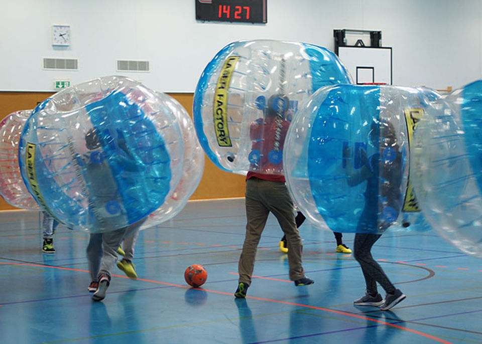 Nach einer kurzen Kennenlern- und Aufwärmrunde wurde in gemischten Teams jeweils 2 mal 7 Minuten gespielt. Es machte allen unheimlich viel Spaß, im riesigen Luftkissen Tore zu ergattern, wobei gegeneinander stoßen und springen ausdrücklich erlaubt und erwünscht war. Eine tolle Erfahrung und natürlich krönender Abschluss der Herbstferien, bei der die Förderung des Teamgedankens sowie besondere Erlebnisse und viel Bewegung garantiert waren.