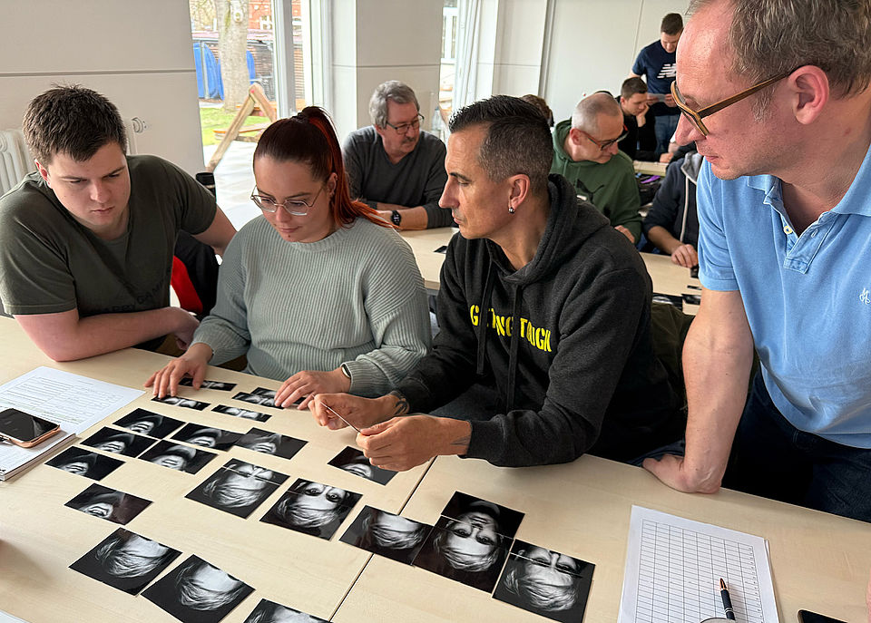 Im ersten Schritt standen das richtige Lesen und Einschätzen der menschlichen Mimik im Mittelpunkt. Die Mitarbeiter des Rettungsdienstes hatten dabei die Aufgabe anhand verschiedener Gesichtsausdrücke zu erkennen, ob seitens des behandelten Patienten eine Gefahr ausgeht oder nicht. Hier entscheiden oftmals schon Millisekunden darüber, ob sich die aktuelle vorgefundene Situation zu einer Krise entwickelt.