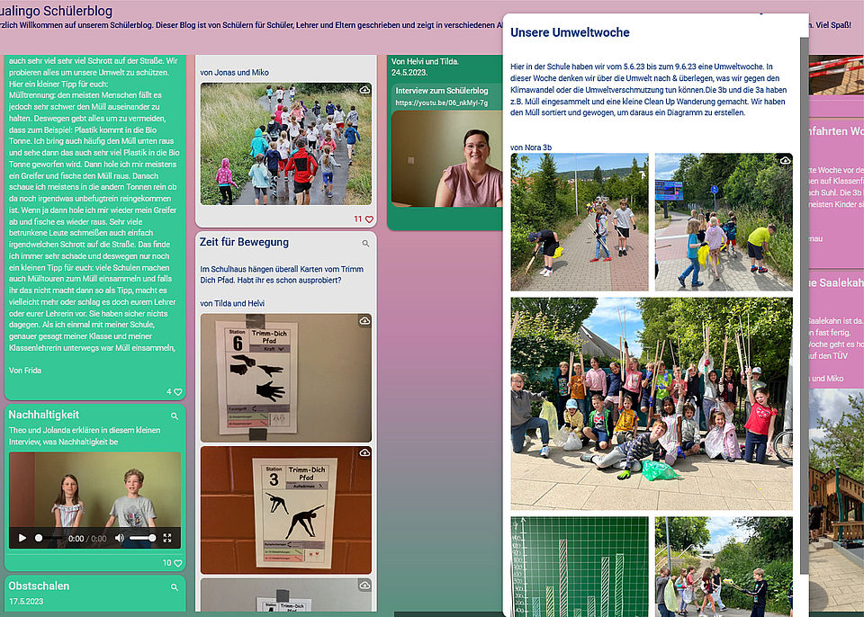Statt der klassischen Schülerzeitung arbeiten unsere Schulkinder an einem Schülerblog, in dem sie von allem berichten, was sie beschäftigt. Hier verknüpfen sich dann wieder die Themen: „Umwelt und Nachhaltigkeit“ ist eine eigene Rubrik im Schülerblog. Alle Beiträge werden von den Kindern selbst verfasst.