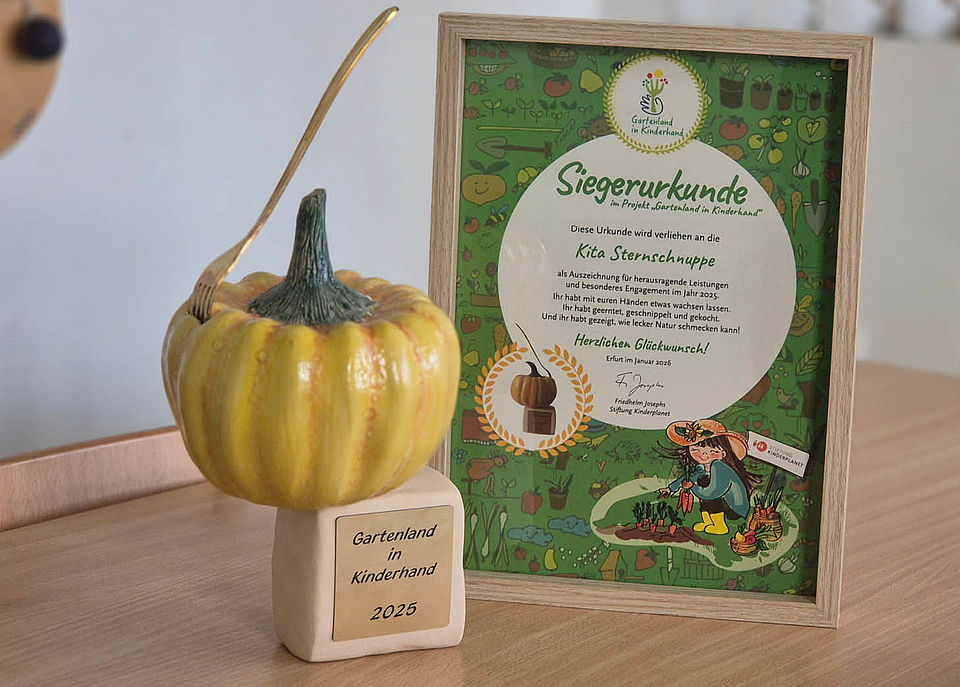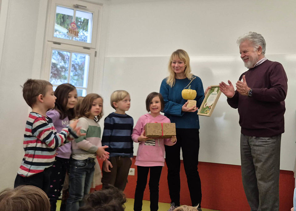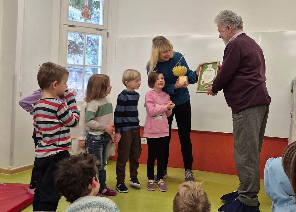 Josephs überreichte die Auszeichnung in Form eines Kürbisses mit Goldener Gabel und Urkunde als wertvolle Anerkennung für die Arbeit des gesamten Kita-Teams.