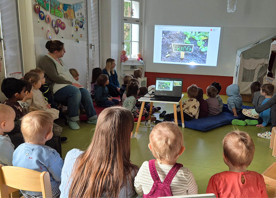 „Mein Garten ist mein Paradies…“ trällert es aus den Lautsprecherboxen. Die Kitakinder haben eigens für ihr Projekt mit den Erzieherinnen ein Lied einstudiert. Während der Diashow, die den Beginn ihres Projekts im Garten und alle Schritte bis zum fertigen Lebensmittel präsentiert, wird ihr Lied im Hintergrund abgespielt.