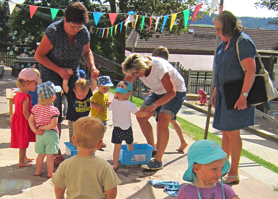 Und das tun sie! Alle Gruppen demonstrierten ganz stolz ihre Kneipperfahrungen - vom Wassertreten über Lakenlauf bis hin zur Zubereitung von gesunden Aufstrichen und ausgiebigen Toben an der frischen Luft. Und natürlich präsentierten die Kinder auch den neu gestalteten Kräutergarten. Die Kneipp-Begutachter waren begeistert.