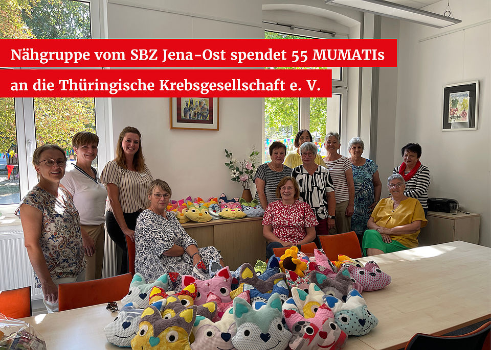 Die Nähgruppe des DRK-Seniorenbegegnungszentrums in Jena-Ost „DIENSTAGSQUILTERINNEN“ war fleißig: Insgesamt 55 so genannte „MUMATIS“ (kurz für Mut-Mach-Tierchen) nähten die Damen. Über mehrere Stunden und mit vielen Metern Stoff entstanden die kleinen Tiere, die als Spende der Thüringischen Krebsgesellschaft e. V. überreicht wurden.