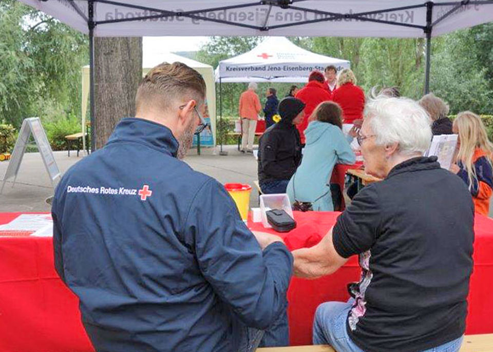Das Begegnungszentrum Jena Ost, die Sozialstation Jena-Camburg und die Bilinguale Ganztagsgrundschule DUALINGO beteiligten sich an der Veranstaltung. Die Besucher konnten sich an den DRK-Ständen zu den vielfältigen Angeboten, Karrieremöglichkeiten und dem Schulkonzept informieren, sich die Blutzuckerwerte messen lassen und bei selbstgebackenen Kuchen und Kaffee entspannt eine Pause eingelegen. Außerdem gab es Kreativangebote sowie Profitipps von den Experten der Teddy-Nähgruppe.