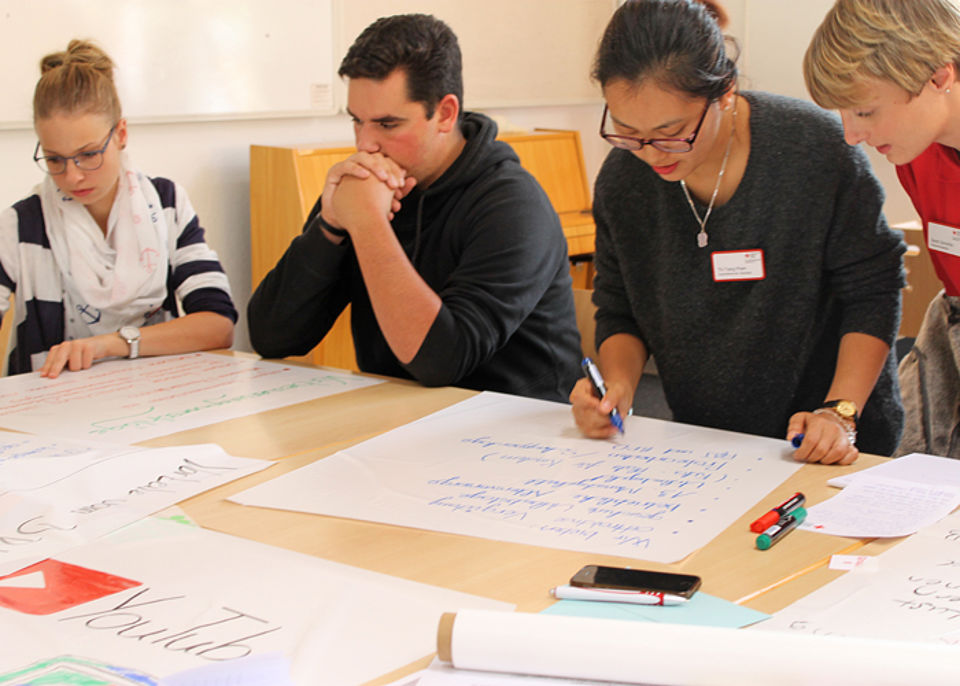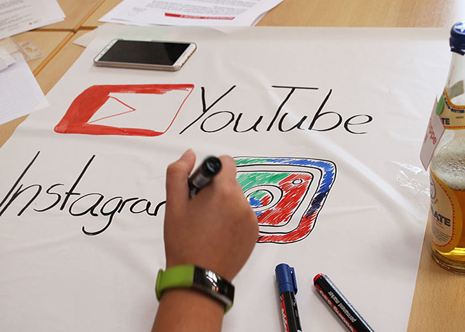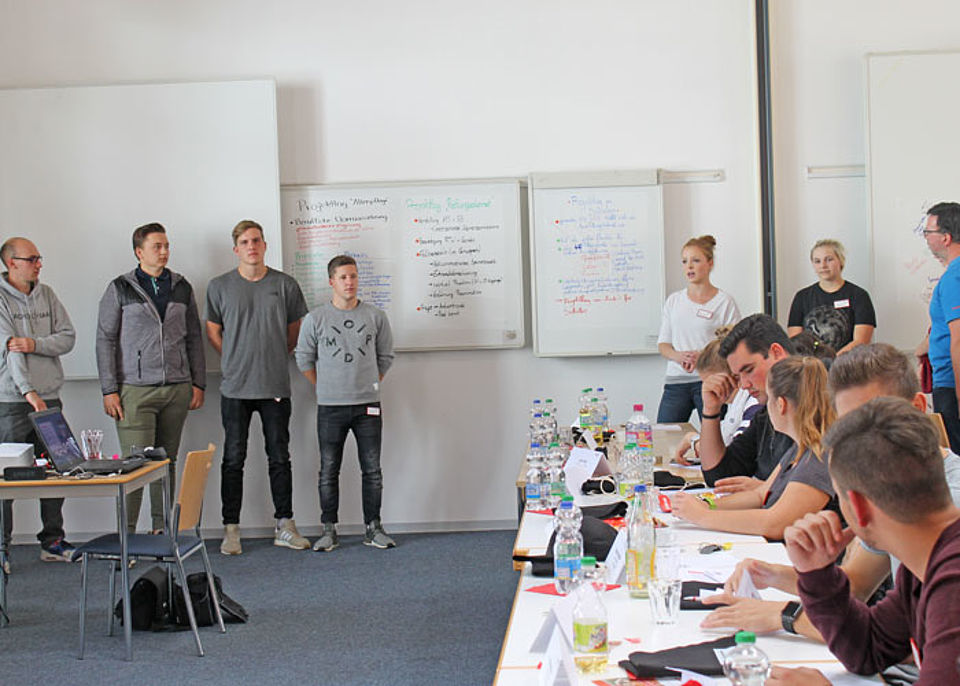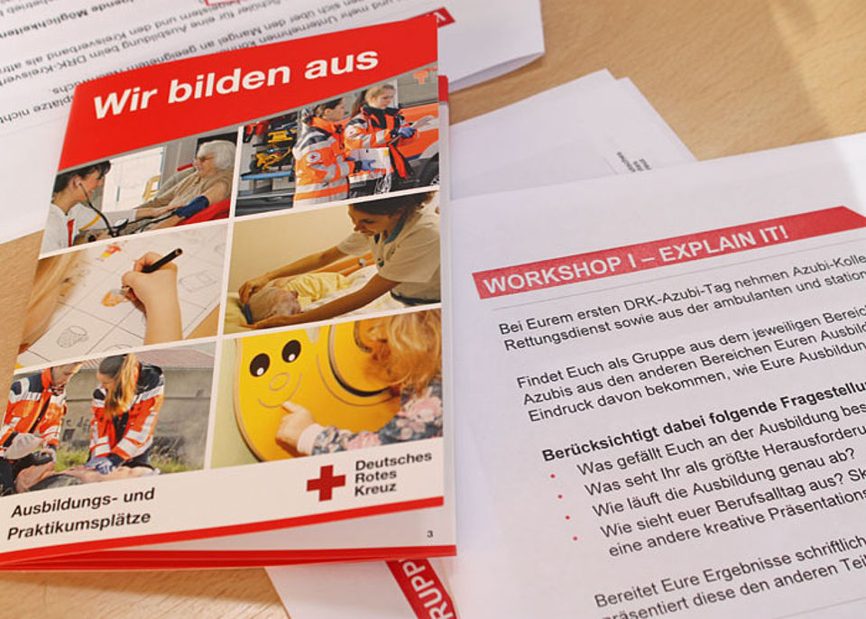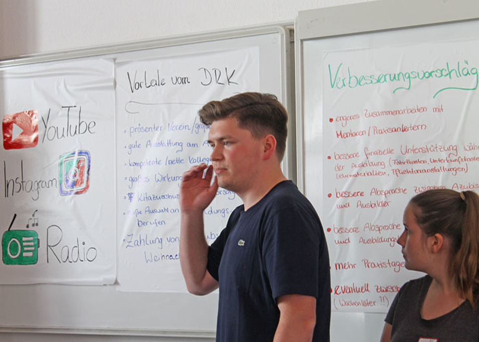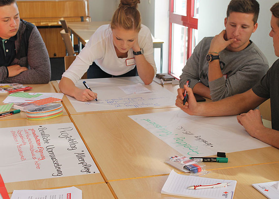 Anschließend wurden die verschiedenen Ausbildungsberufe in Kleingruppen gemischt. Gemeinschaftlich und in einem starken Team wurden Ideen und Konzepte entwickelt, wie neue Azubis an den DRK-Kreisverband herangeführt werden können, wie diese Zielgruppe in den Medien optimal erreicht werden kann und wie ein Messestand konzipiert werden sollte, um ein jugendliches Publikum zu begeistern. Die Ergebnisse wurden anschließend den beiden anderen Teams präsentiert.