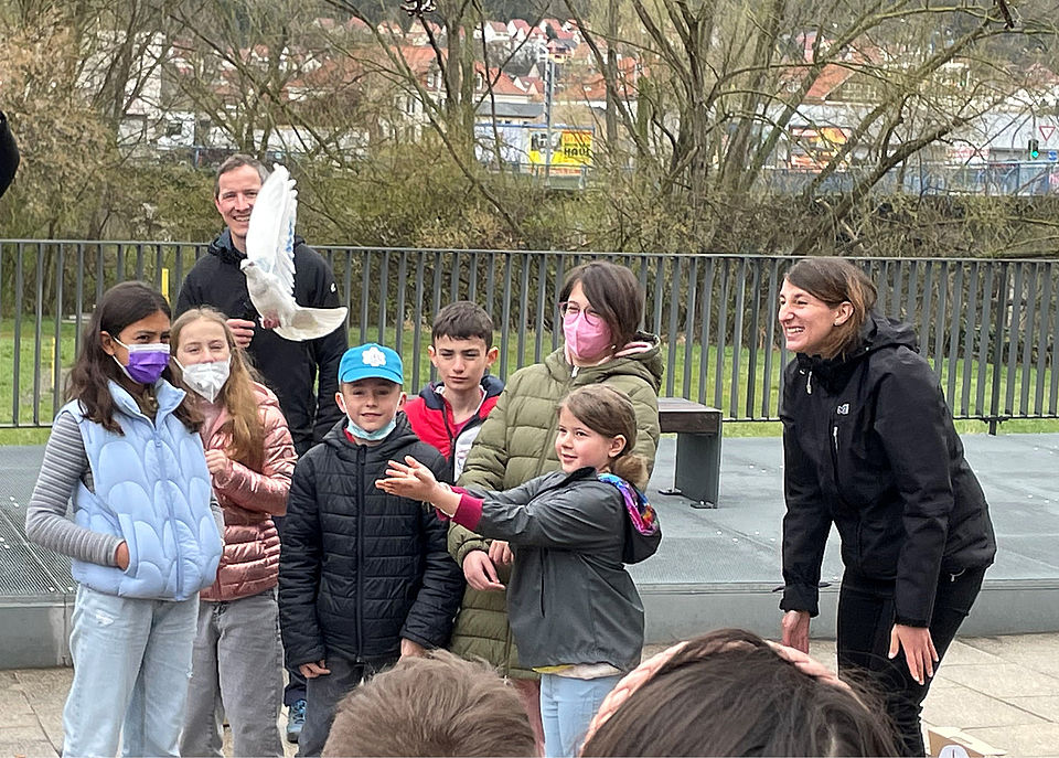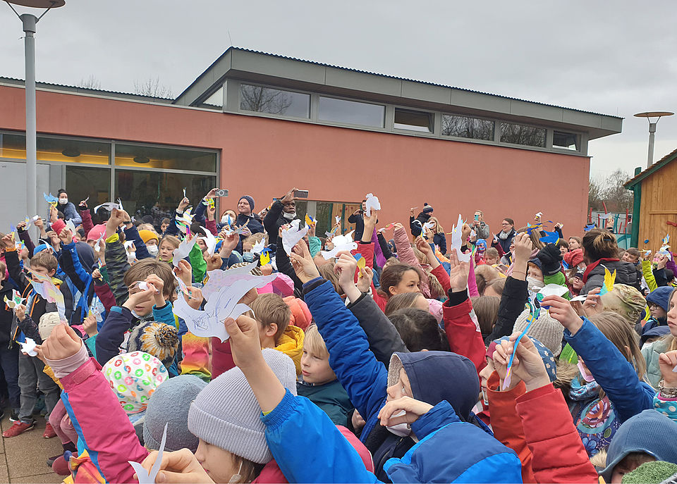 Zur Begrüßung wurde viel gesungen und gemeinsam getanzt. Tanzen und Singen verbindet schon immer ganz unterschiedliche Kulturen. Geschenke wurden verteilt und als ganz besonderer Moment wurde eine echte Friedenstaube in den Himmel gelassen und selbstgebastelte in den Nationalfarben der Ukraine hochgehalten. Das Thema des Gewaltkonflikts in der Ukraine und der vielen Geflüchteten beschäftigt die Kinder sehr. In der Schule wird das Thema seitdem behutsam und altersgerecht behandelt, um die Fragen der Kinder zu beantworten und ihnen Ängste zu nehmen.