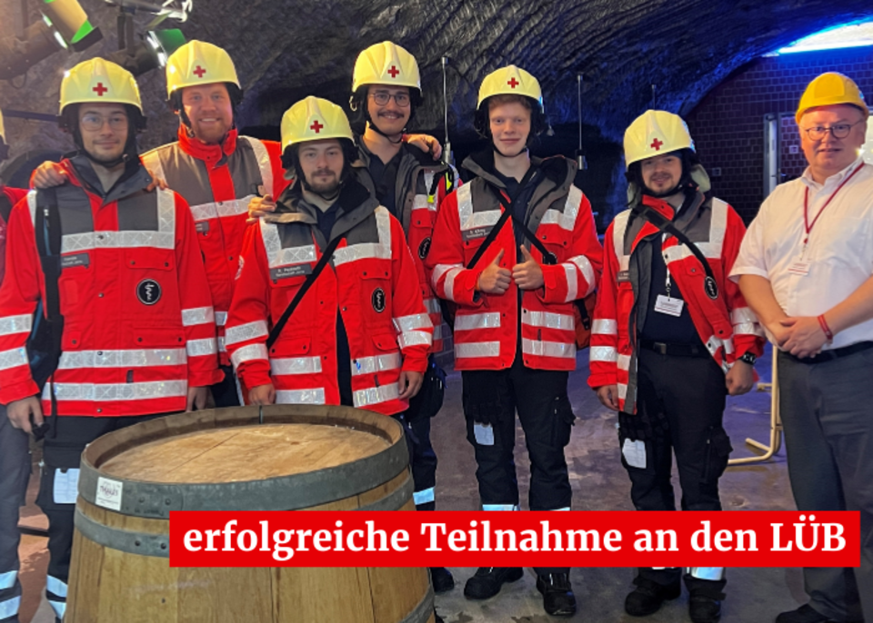 im Erlebnisbergwerk „Glück Auf“ Sondershausen. D.h. zunächst erfolgte über mehr als 600m die Grubeneinfahrt nach unten im klassischen Bergwerkskorb. Durch Einsatzbekleidung, Schutzhelm, Einsatztasche & Co stellte dies schon die erste Herausforderung dar; die Luftdruckunterschiede waren bei der Abfahrt sehr deutlich zu spüren. Im Bergwerk selbst war ein Parcours mit unterschiedlichsten Stationen und den Schwerpunkten u.a. Erste Hilfe, Betreuungsdienst, Technik und Sicherheit, Sanitätsausbildung mit Ergänzungsthemen sowie Rotkreuzwissen unter Einbindung der Bergwerksinfrastruktur zu bewältigen, bevor es erst nach knapp 8 Stunden mit dem Fahrkorb wieder ans Tageslicht ging.