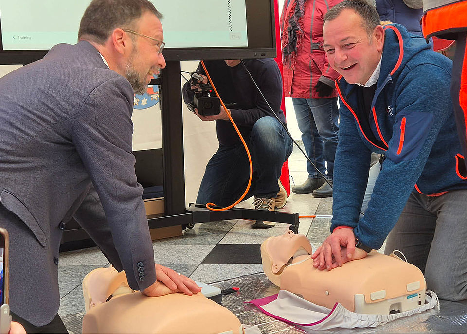 Gleich nach der offiziellen Begrüßung zeigten Schreiber und Nitzsche, dass sie nicht nur reden, sondern auch anpacken können: An einer Erste‑Hilfe‑Übungspuppe traten beide in einem kleinen Wettbewerb gegeneinander an – wer beherrscht die Herzdruckmassage besser? Das Publikum hatte sichtlich Freude an diesem sportlich‑humorvollen Einstieg.