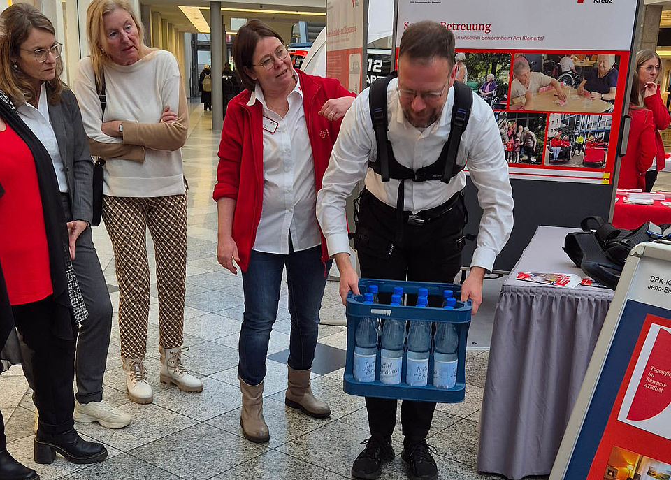 Ein weiterer Höhepunkt des Tages: das Exoskelett, das in der Altenpflege als rückenschonende Hebehilfe eingesetzt wird. Sowohl der Oberbürgermeister als auch zahlreiche Gäste probierten die Technik aus – und waren beeindruckt, wie leicht sich schwere Bewegungen plötzlich anfühlen.