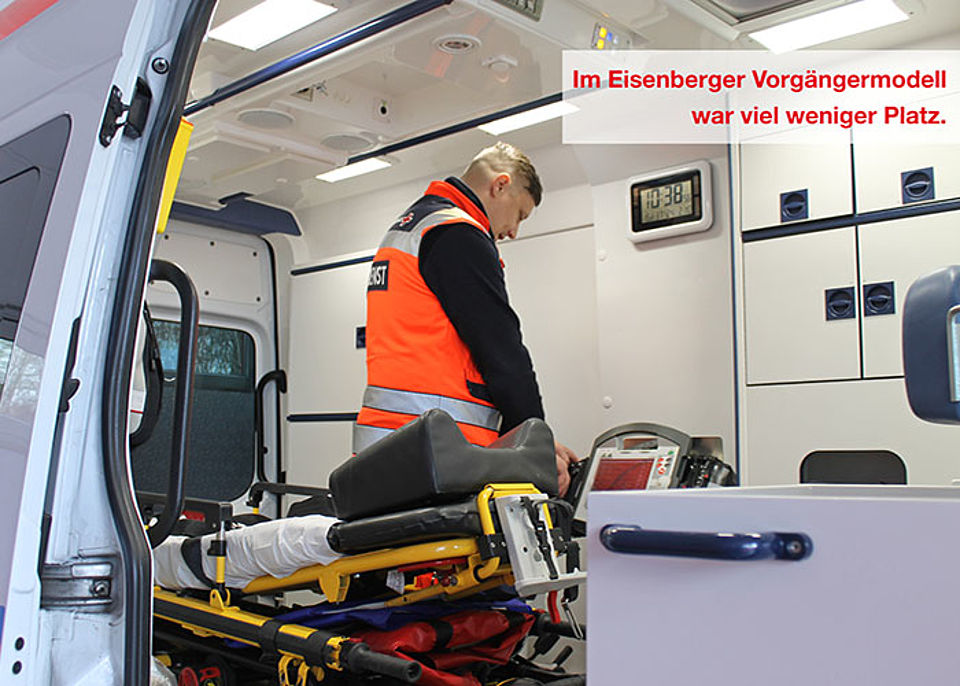 Die Rettungswache Eisenberg verfügt nun ebenso über ein Fahrzeug mit Kofferaufbau, welches viel breiter ist und somit mehr Platz bietet. Platz, der sowohl für die umfangreiche medizinische Ausrüstung als auch für das Personal benötigt wird. Schließlich sind die beiden Wachen Lehrrettungswachen und somit fährt auch immer ein Azubi mit. Rettungssanitäter Maik Pavel und Notfallsanitäter Fabian Knoll nahmen freudestrahlend die Neuanschaffungen in Empfang.