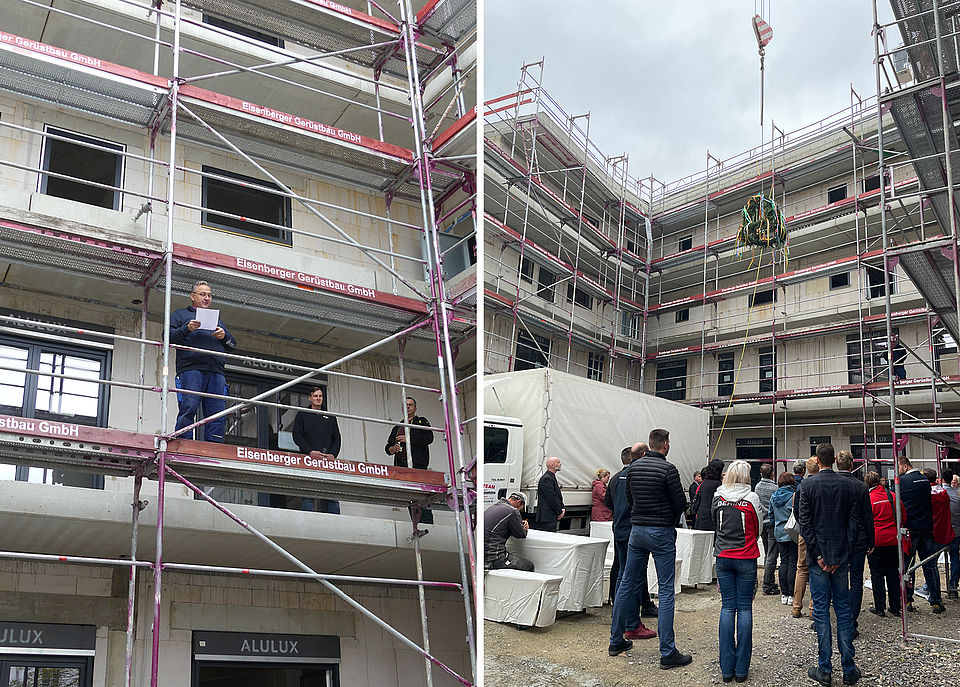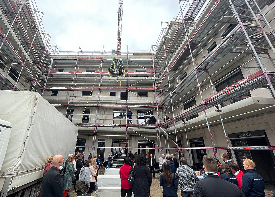 Beste Wünsche verbunden mit Lob und Anerkennung sowie einem kurzen Rückblick auf die bisherige Bauphase gab es offiziell durch Dr. Günter Ahnert, 1. Beigeordneter der Stadt Stadtroda, der stellvertretend für den Bürgermeister gekommen war. Ahnert betonte in seiner Ansprache nochmals, dass der Neubau das Stadtbild nachhaltig präge und eine echte Bereicherung für die Bürgerinnen und Bürger Stadtrodas sei.