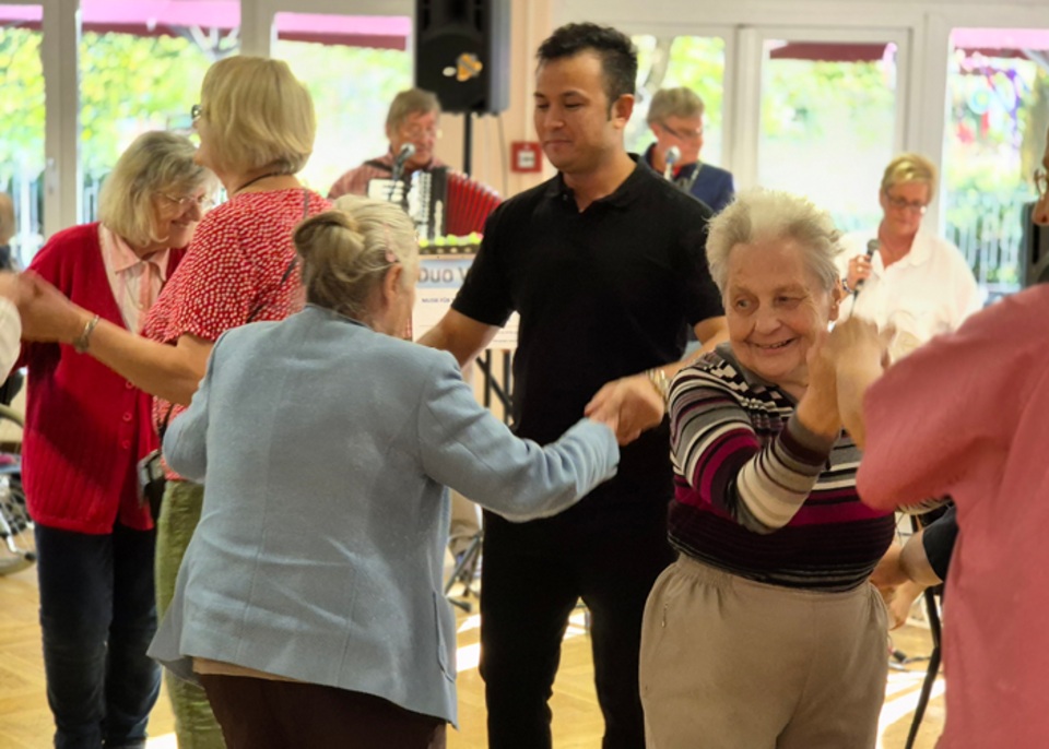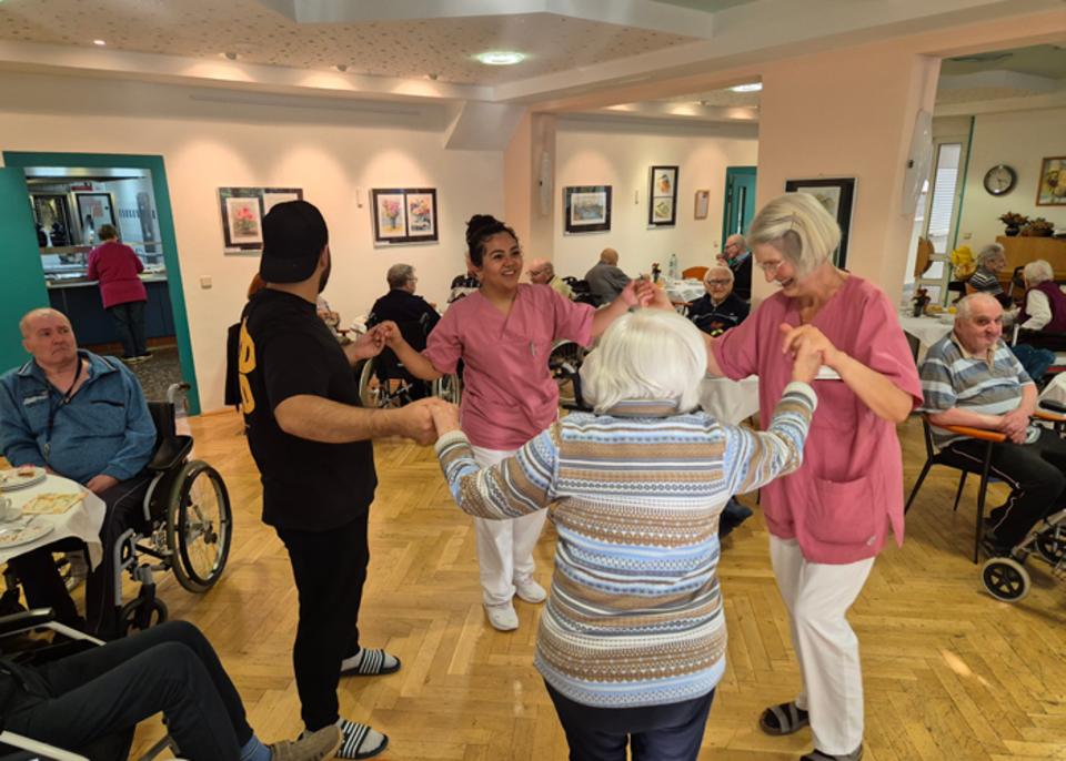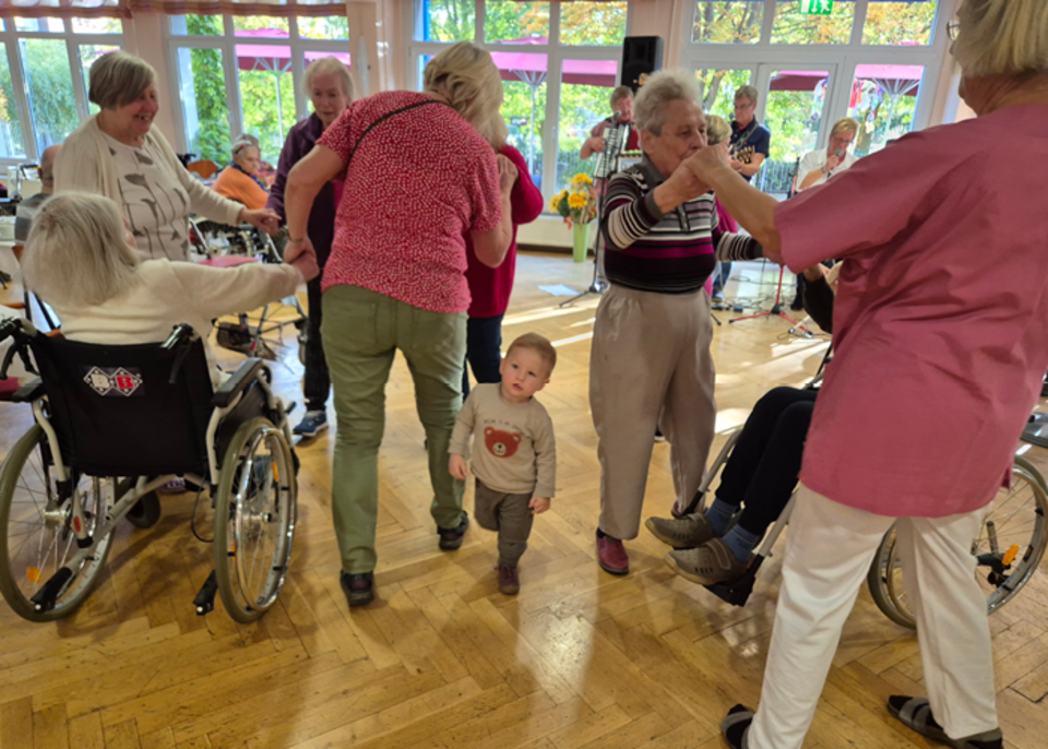 Die Spannweite der Altersgruppen reichte von süßen 18 Monaten bis hin zu stolzen 103 Jahren! Die im Heim lebenden Menschen, junge Gäste (einige Mitarbeiter brachten ihre Kinder mit) und natürlich Pflegefachpersonal genossen gemeinsam frischen Kaffee, leckeren Kuchen und eine fruchtige Bowle. Mit dabei waren auch engagierte Auszubildende, darunter Menschen aus El Salvador, und zwei Jugendliche aus dem Kinder- und Jugendwohnen, die das bunte Miteinander bereicherten. So versammelten sich fünf Generationen unter einem Dach und verbrachten eine unvergessliche Zeit voller Gespräche, Schunkeln, Tanzen und Lachen.