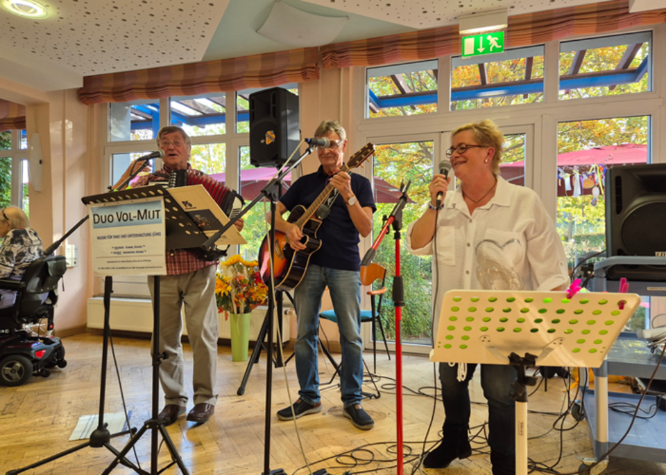 Für musikalische Unterhaltung sorgte das Duo VOL-MUT, das mit beliebten Schlager- und Volksliedern die Herzen der Anwesenden zum Schwingen brachte. Die fröhliche Musik lud zum Mitsingen, Mitklatschen und Tanzen ein, sodass die herbstliche Stimmung von guter Laune und Lebensfreude erfüllt war. Am Ende spielte eine Auszubildende aus El Salvador etwas Salsa-Musik ab und brachte noch frische spanische Klänge in die schon augehellte Stimmung.