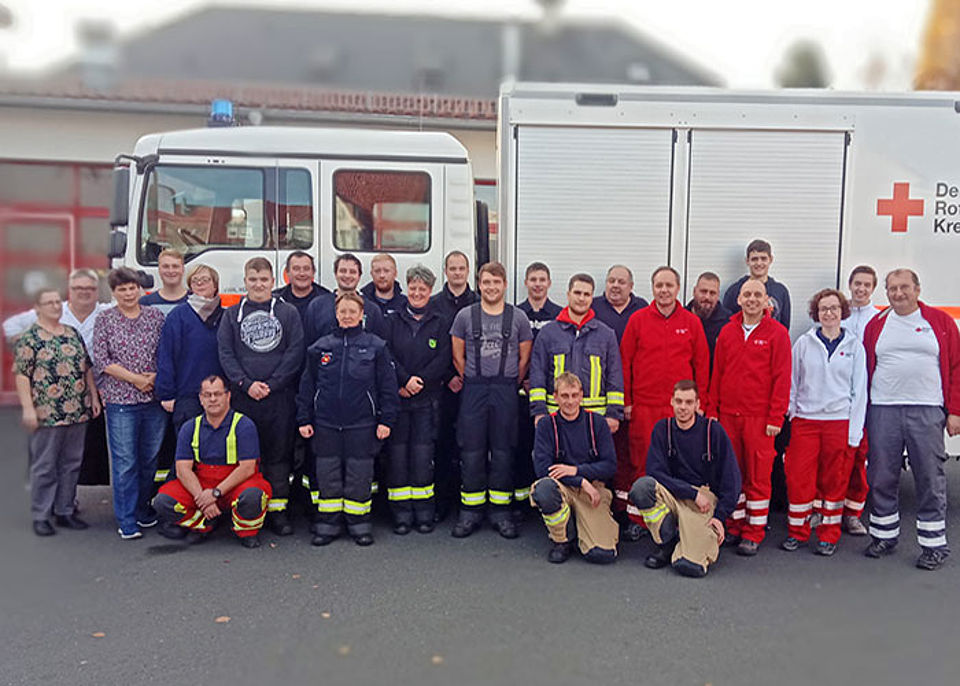 Gegenüber den Lehrgängen aus den Vorjahren gab es zwei Unterschiede. Zum einen überwogen die Teilnehmer der Freiwilligen Feuerwehren aus Hummelshain, Kahla, Bad Klosterlausnitz, Hermsdorf, Tautenhain und Schkölen. Nur fünf Kameraden kamen aus den eigenen Reihen des DRK, davon vier aus der Bereitschaft Jena und einer aus Eisenberg. Zum anderen wurde das bewährte Ausbilderteam um Wilfried Krüger und Detlef Taugnitz durch den zukünftigen Ausbilder Sebastian Marx unterstützt.