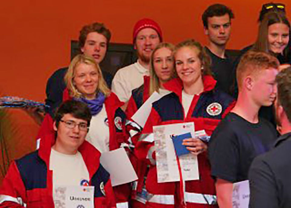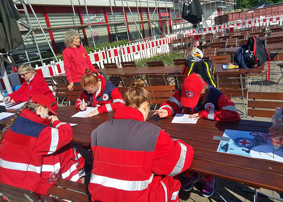 Dazu musste am Vormittag ein Erste-Hilfe-Parcours absolviert werden. Neben Theorie- und Knotenstationen warteten vor allem anspruchsvolle Erste-Hilfe-Aufgaben auf die Wettkämpfer. So mussten unter anderem eine bewusstlose Person aus dem Strömungskanal gerettet und anschließend reanimiert sowie Verletzte nach einem Verkehrsunfall versorgt werden. Außerdem musste bewiesen werden, dass man beim Aufeinandertreffen von Fußballfans verschiedener Vereine Ruhe bewahren und die sanitätsdienstliche Versorgung sicherstellen kann. Beide Mannschaften aus Jena zeigten, dass sie mit den Erwachsenen mithalten können und sicherten sich an den Stationen viele wichtige Punkte. Bei der Versorgung der Verkehrsunfallopfer gehörten sie sogar zu den Besten und sicherten sich die höchste Punktzahl aller Thüringer Mannschaften.