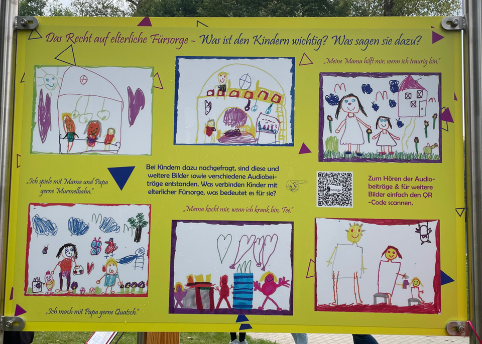 Nach dem offiziellen Teil war es dann endlich so weit: Die Kinder konnten unter viel Aufregung den neuen Teil des elementaren Rechts auf elterliche Fürsorge gemeinsam mit den Pädagoginnen und Pädagogen enthüllen. Zu sehen sind Zeichnungen der Kinder, die zeigen, was den kleinen Erdenbürgern wichtig ist, wie „Meine Mama hilft mir, wenn ich traurig bin.“ oder „Ich mach mit Papa gern Quatsch.“