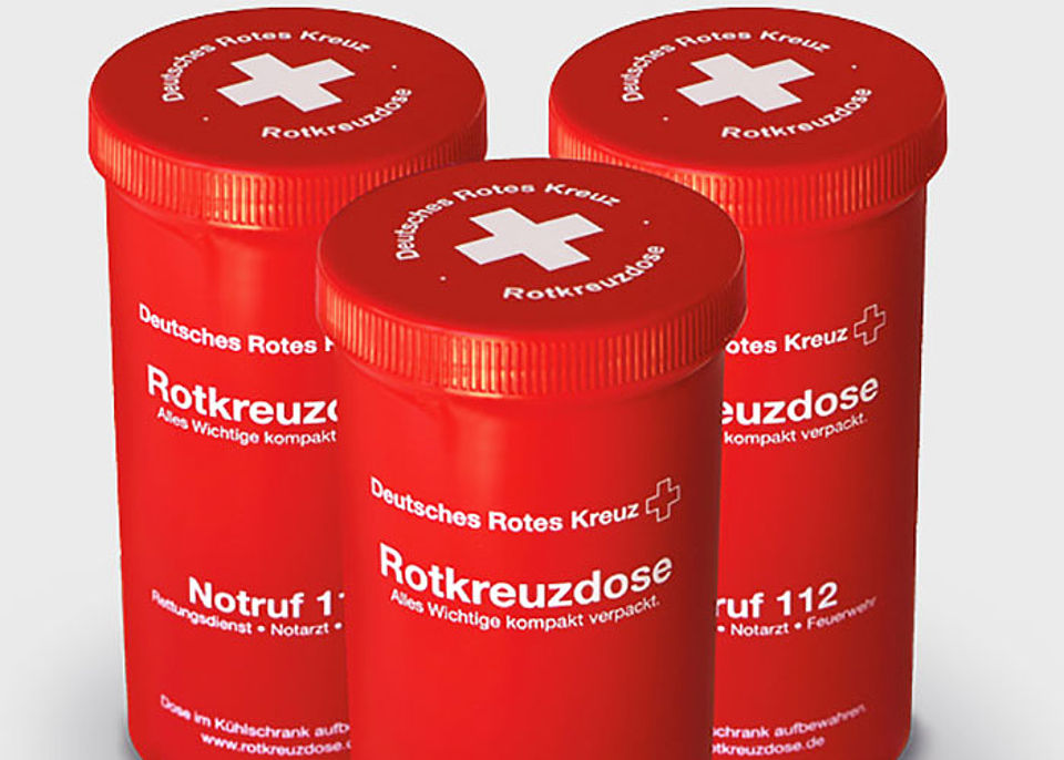 Denn mit einer Rotkreuzdose kann man sich auf Notfälle gezielt vorbereiten. Man hinterlegt schon im Vorfeld auf einem Datenblatt seine Gesundheitsdaten und Medikamentenpläne, notiert auch Kontaktdaten von Hausarzt oder Pflegedienst. Hinweise zu einer Patientenverfügung oder Notfallkontakte sollen ebenfalls eingetragen werden. Dass es eine solche Rotkreuzdose gibt, das kann man den Helfern signalisieren, indem man Hinweisaufkleber an der Wohnungstür sowie am Kühlschrank anbringt. Denn der Kühlschrank ist der Aufbewahrungsort für die Dose – er ist in nahezu jeder Wohneinheit problemlos und sekundenschnell zu finden.