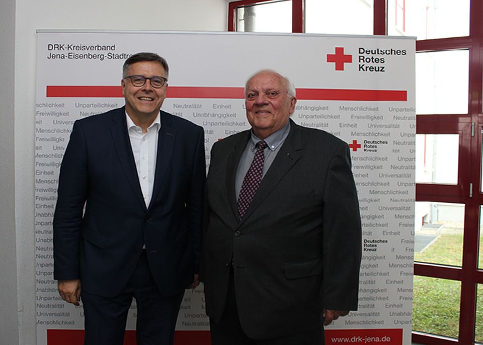 Das Deutsche Rote Kreuz bedankt sich nochmals bei Herrn Bayer für sein herausragendes Engagement und seiner Leidenschaft im Dienste des Roten Kreuzes und gratuliert Herrn Schütze herzlich zu seiner neuen Funktion als Präsident des DRK-Kreisverbandes Jena-Eisenberg-Stadtroda e.V.