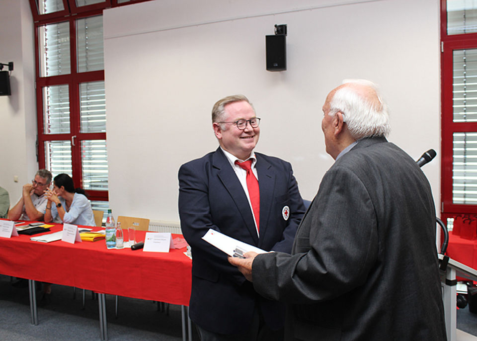 Herr Gerhard Bayer hat sich während seiner langjährigen ehrenamtlichen Präsidentschaft für das Deutsche Rote Kreuz im Allgemeinen und für unseren Kreisverband im Besonderen verdient gemacht. Neben seinem Einsatz für sämtliche Belange der verschiedensten und über die Jahre gewachsenen Betätigungsbereiche des Kreisverbandes erfuhren seine besondere Aufmerksamkeit und eine spezielle Förderung jederzeit die ehrenamtliche Bereiche - so auch ganz speziell die Rotkreuzgemeinschaften. Aus diesem Grund ist es uns eine große Freude Herrn Bayer die Ehrenmitgliedschaft verleihen zu dürfen.