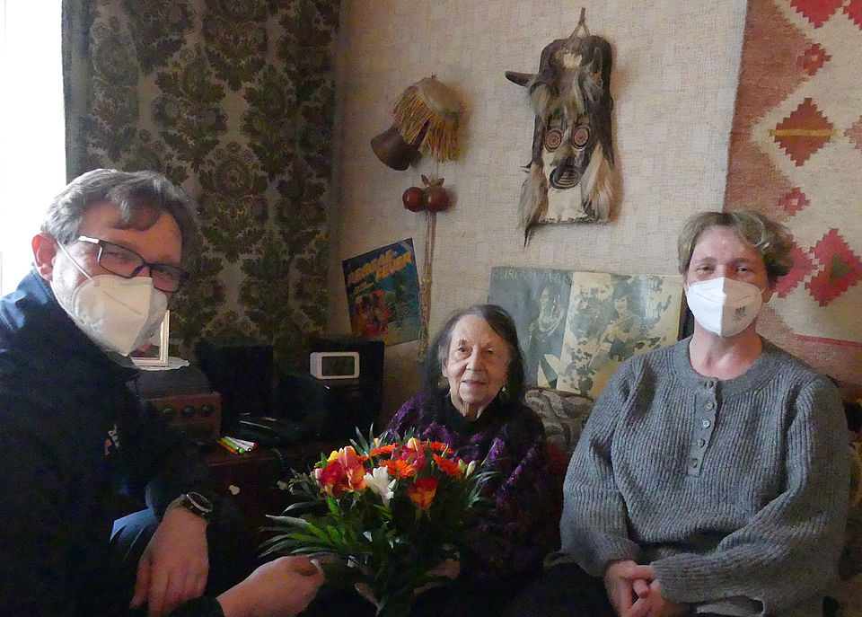 Die Klientin Gilda Hase-Walter feiert ihren 101. Geburtstag mit ihren Pflegern aus dem ambulanten Pflegedienst in Jena.