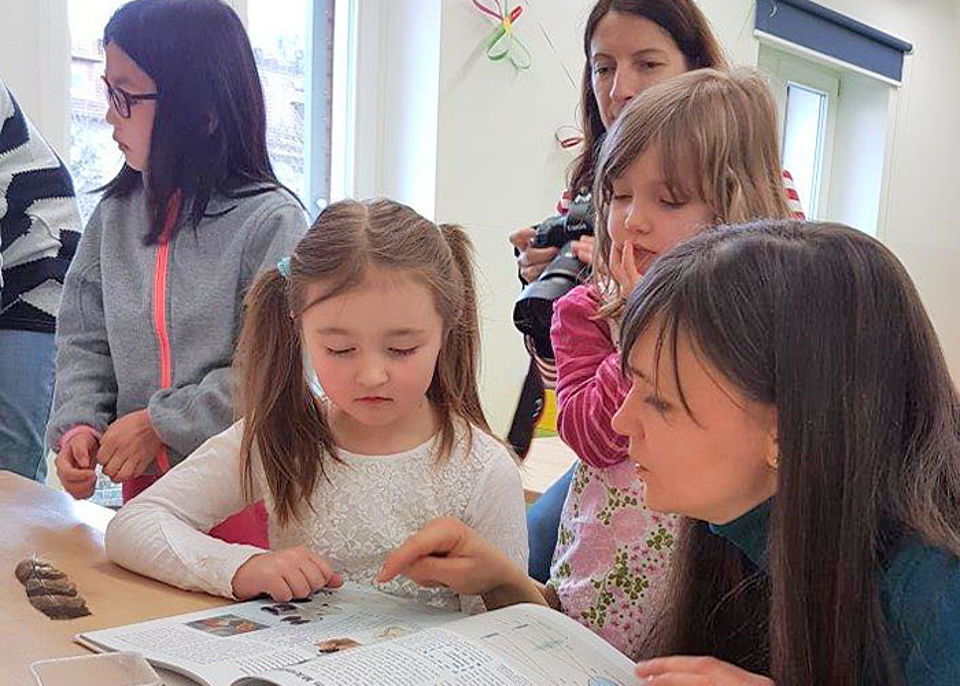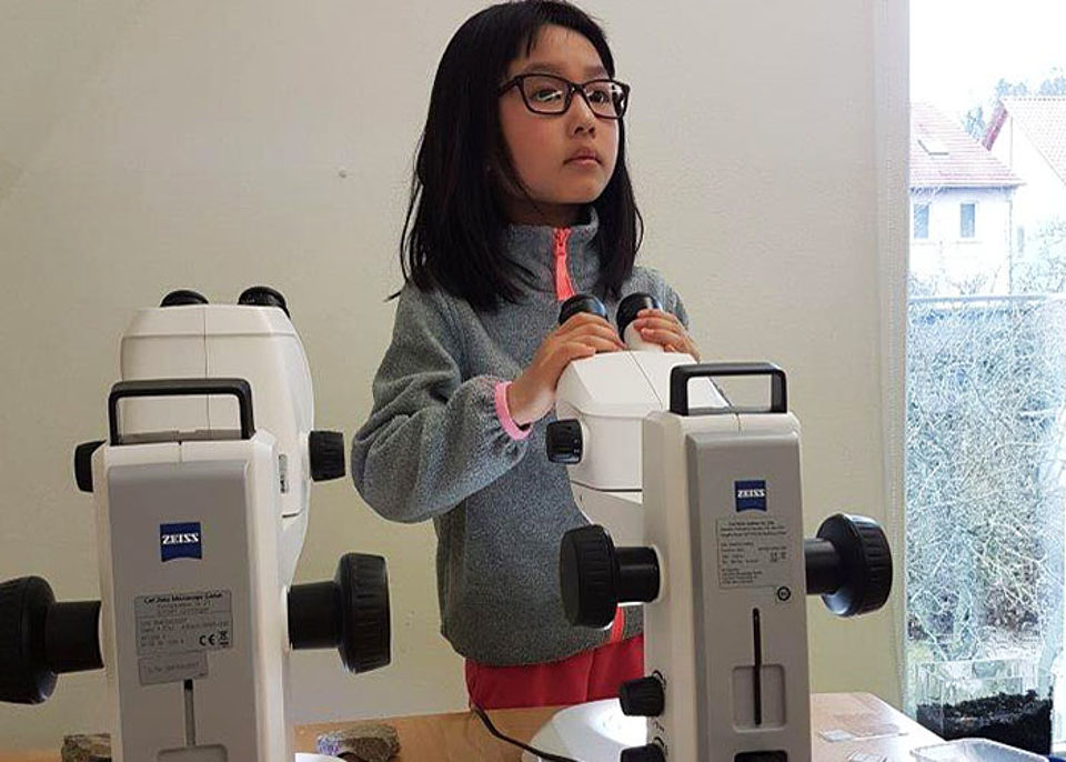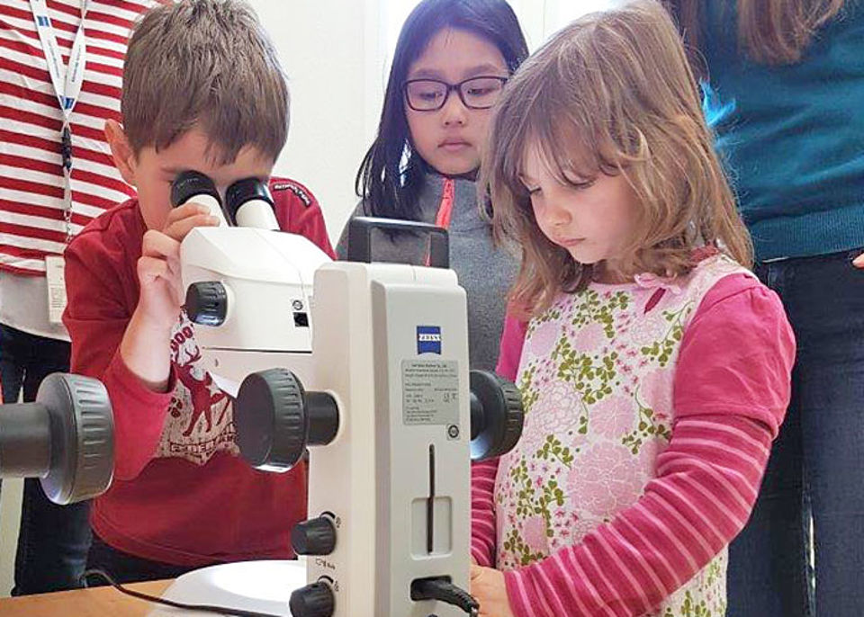 Zwei Mitarbeiterinnen von ZEISS waren zu Gast in der Kita Sternschnuppe und mikroskopierten mit den "Haus der kleinen Forscher" Kindern. Untersuchungsobjekte waren all die Dinge, die mit bloßem Auge nicht erkennbar sind: Insekten, Fossilien, Blumenwasser aus der Vase und vorbereitete Präparate auf Objektträgern.