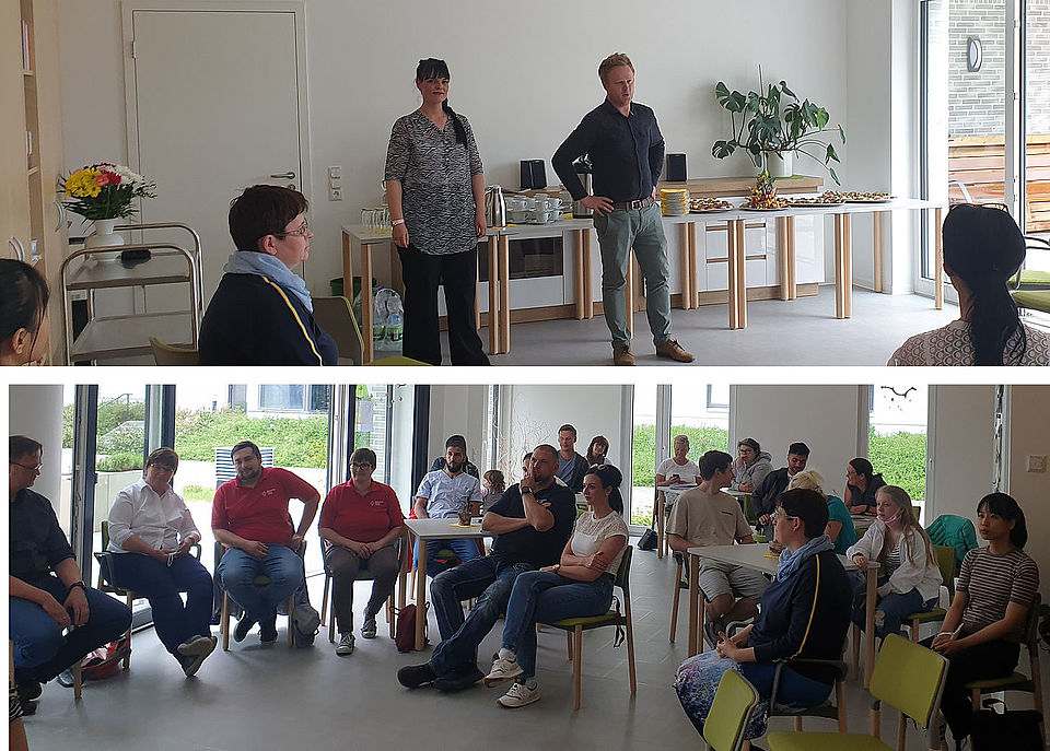 Der Nachmittag der Vorstellungsrunde fand im Rosepark ATRIUM in Jena Nord statt, wo auch das "Pflegekabinett" zu Hause ist. Hier werden die herangehenden Pflegefachkräfte in Theorie und praktisch an der Pflegepuppe geschult. Die acht Auszubildenden des ersten Lehrjahres besuchten zusammen mit ihren Pflegedienst- und Praxisanleitern die Vorstellung, welche Raum für Begegnung und Fragen sein sollte. Zusammen mit Frau Händschel bekamen sie sogleich eine Unterweisung im Verbandanlegen an der Puppe.