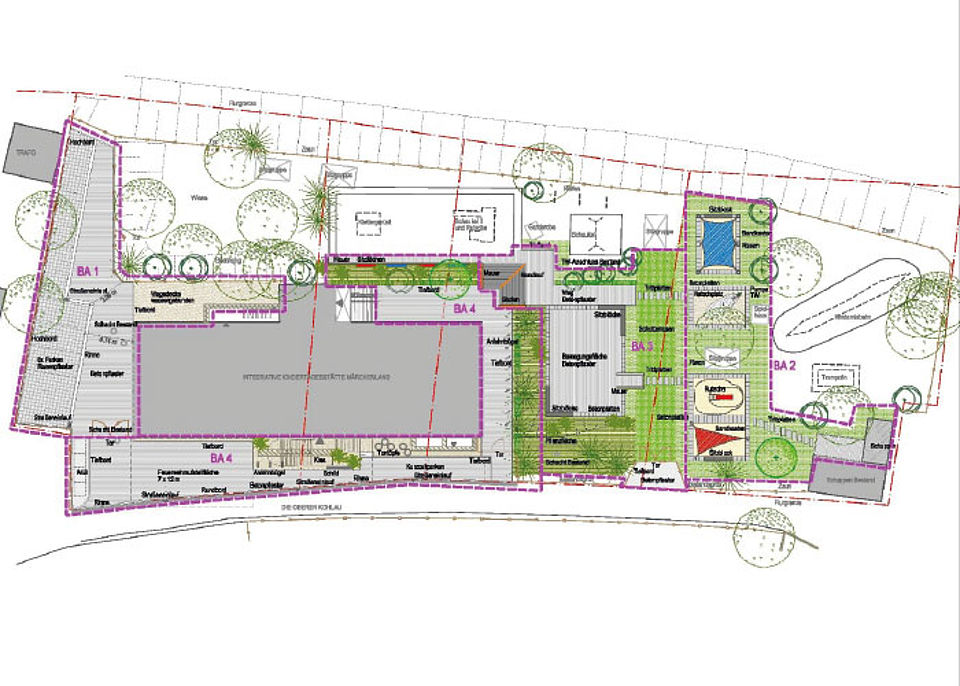 In Zusammenarbeit mit externen Firmen entstand daher ein neuer Plan für ein naturnahes Außengelände mit Spielflächen für den Kleinkindbereich sowie ausreichend Bewegungsflächen mit vielseitigen Spielmöglichkeiten sowie gleichermaßen Platz für Ruhe, Fantasie, Gestalten und Begegnung. Die Bepflanzung mit heimischen Sträuchern, Bäumen und Hecken lockt zudem Tiere an, die erlebt und beobachtet werden können.