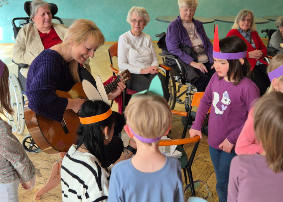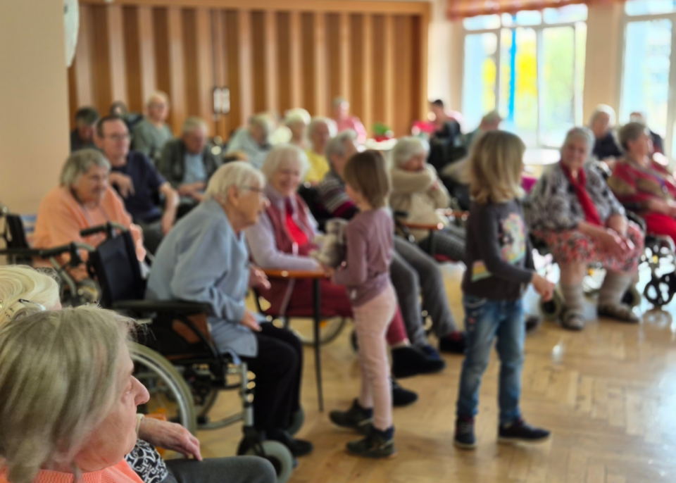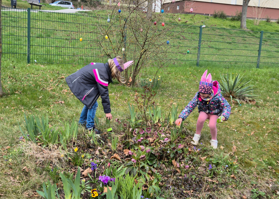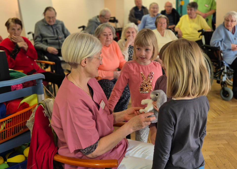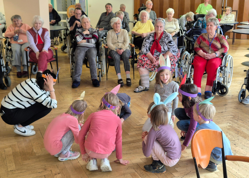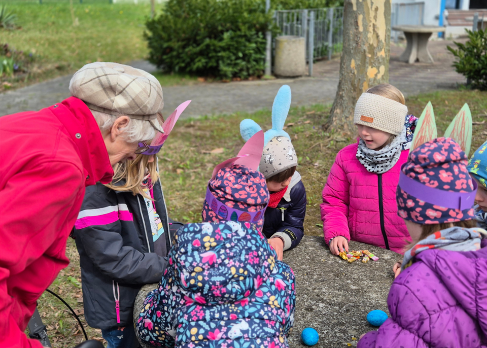 Ein besonderes Erlebnis war der Besuch der Kinder der Kita Sternschnuppe im Seniorenheim Am Kleinertal. Dort versteckte der Osterhase Kleinigkeiten für die Kita-Kinder in der Außenanlage des Seniorenheims. Gemeinsam mit den Bewohnerinnen und Bewohnern suchten sie Ostereier und führten im Anschluss kleine Lieder auf. Die Bewohnerinnen und Bewohner hatten daran besonders viel Spaß – ein schönes Zeichen für gelebte Begegnung zwischen Jung und Alt.