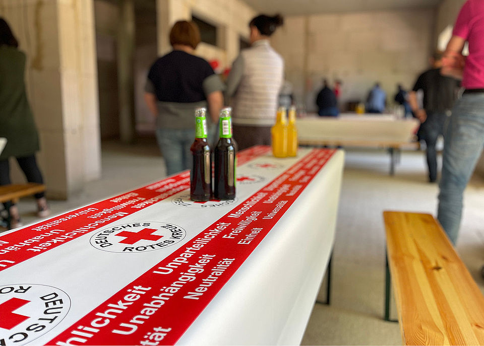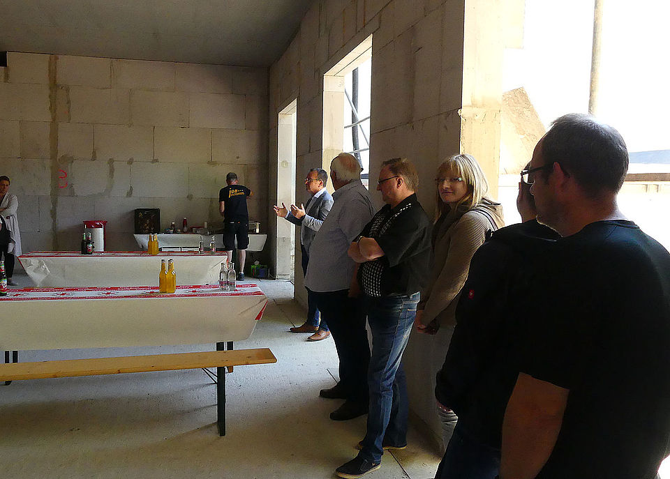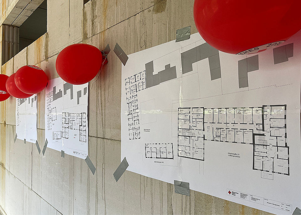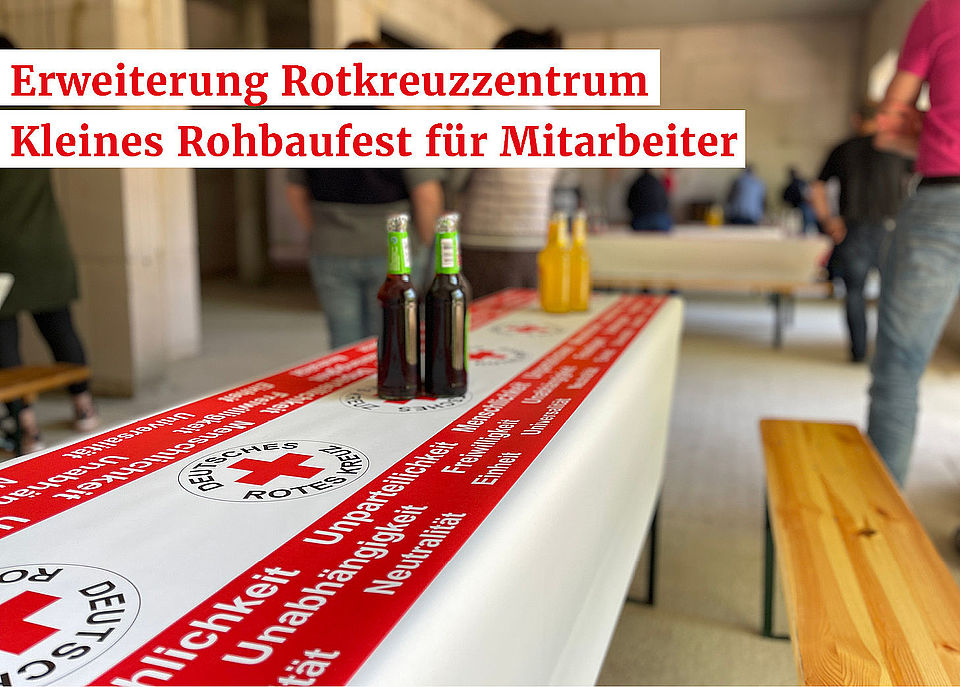 Am 12. Mai 2022 war der Rohbau soweit fertig, dass für die Bauarbeiter sowie die DRK-MitarbeiterInnen ein kleines Rohbaufest veranstaltet wurde. Mit kühlen Getränken und stärkender Rostbratwurst durfte man die noch kahlen neuen Räume besichtigen und auf ausgehangenen Bauplänen die zukünftigen Büros bestaunen.