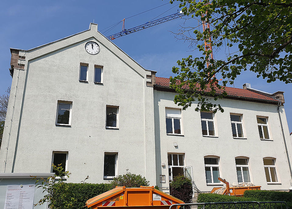 Zu DDR-Zeiten entstand der dazwischenliegende flache Mittelbau. Dieser war nicht erhaltungswürdig und wurde komplett abgerissen. Anfang Oktober 2021 rollte der Bagger an und die Abriss- und Umbauarbeiten konnten starten. Als Ersatz ist ein zweigeschossiger Bau mit Gründach geplant, der eine niedrigere Deckenhöhe hat und nur unwesentlich höher als das frühere mittlere Gebäude wird.