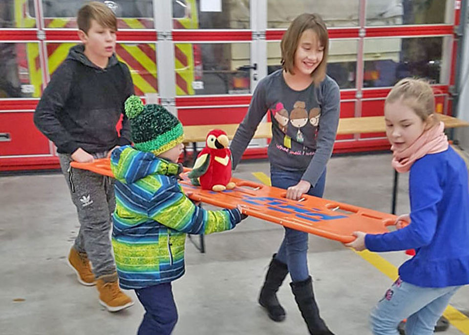 Bei gemeinsamen Aufgaben konnte direkt die Gruppendynamik ausgetestet werden. So mussten die Kinder gemeinsam eine "verletzte Person" transportieren. Außerdem wurde das gegenseitige Anlegen von Verbänden geübt.