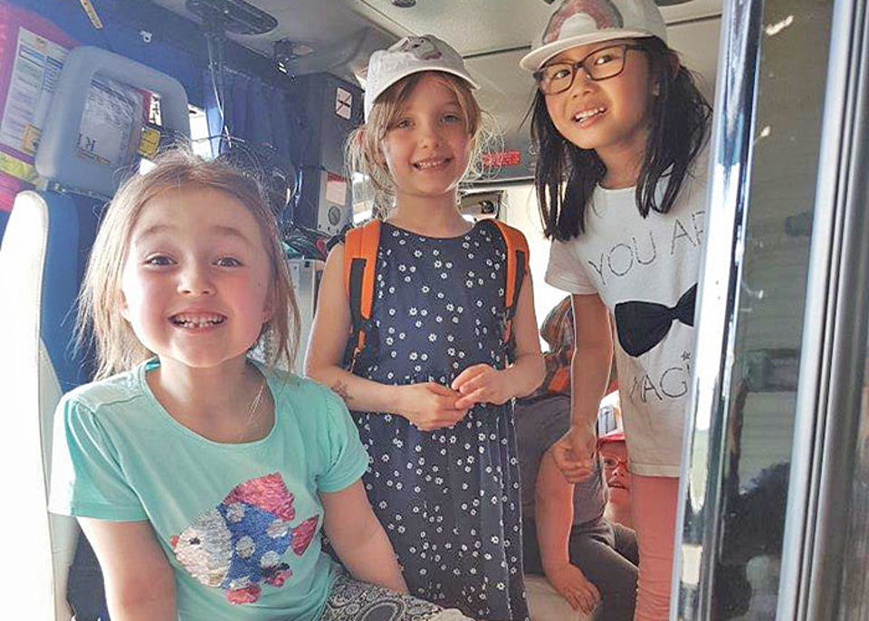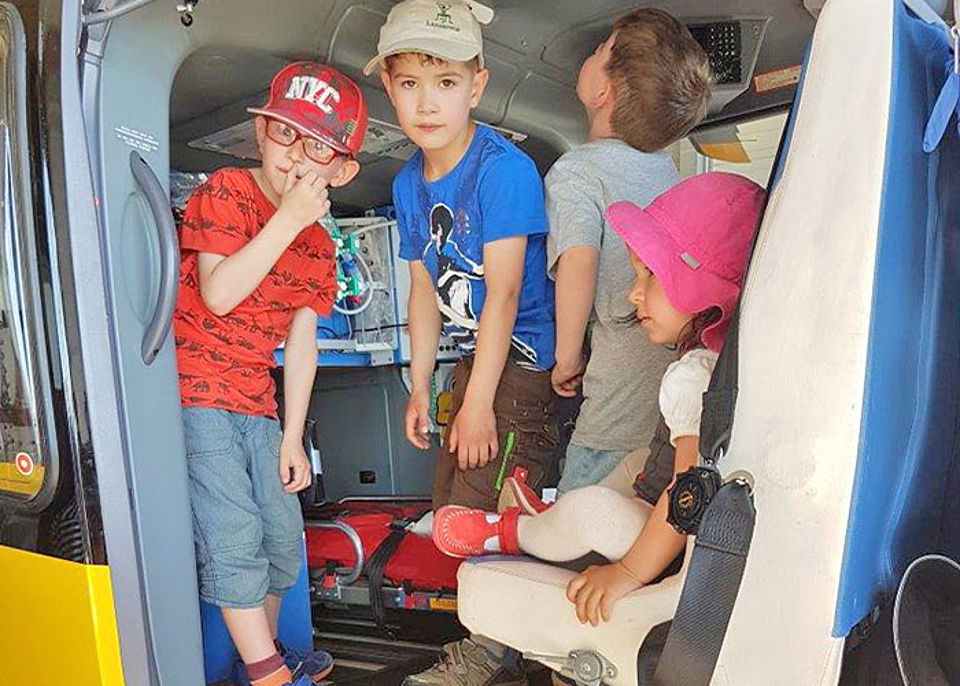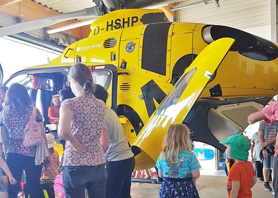 Der Rettungshubschrauber ist täglich von 7 Uhr bis Sonnenuntergang im Einsatz und hat etwa 4 Einsätze pro Tag. Zu einem davon wurde er am Ende der Exkursion gerufen, so dass die Kinder auch noch den Start mitverfolgen konnten. Was für ein Erlebnis! Vielen Dank an das Rettungsteam um Jens Weidhase für diese lehrreiche Stunde.