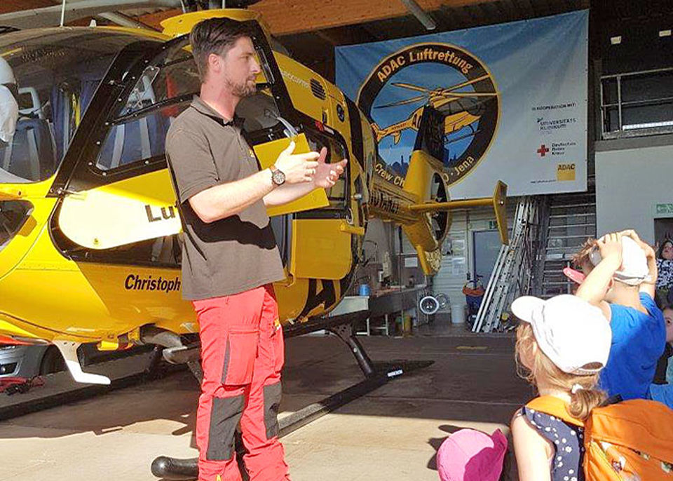 Sternschnuppen-Kinder erlebten noch etwas ganz Spannendes. Sie besuchten, zusammen mit ihren Eltern und Geschwistern, den auf dem Flugplatz Jena/ Schöngleina stationierten Rettungshubschrauber "Christoph 70". Mit großem Interesse wurde bei strahlendem Sonnenschein der gelbe Hubschrauber unter die Lupe genommen. "Wo sind die Spritzen, wo liegt der Patient und wofür sind die Monitore da?" Notarzt und Pilot beantworteten geduldig und ganz kindgerecht die vielen Fragen. Und natürlich durfte sich jedes Kind einmal in den Hubschrauber setzen.