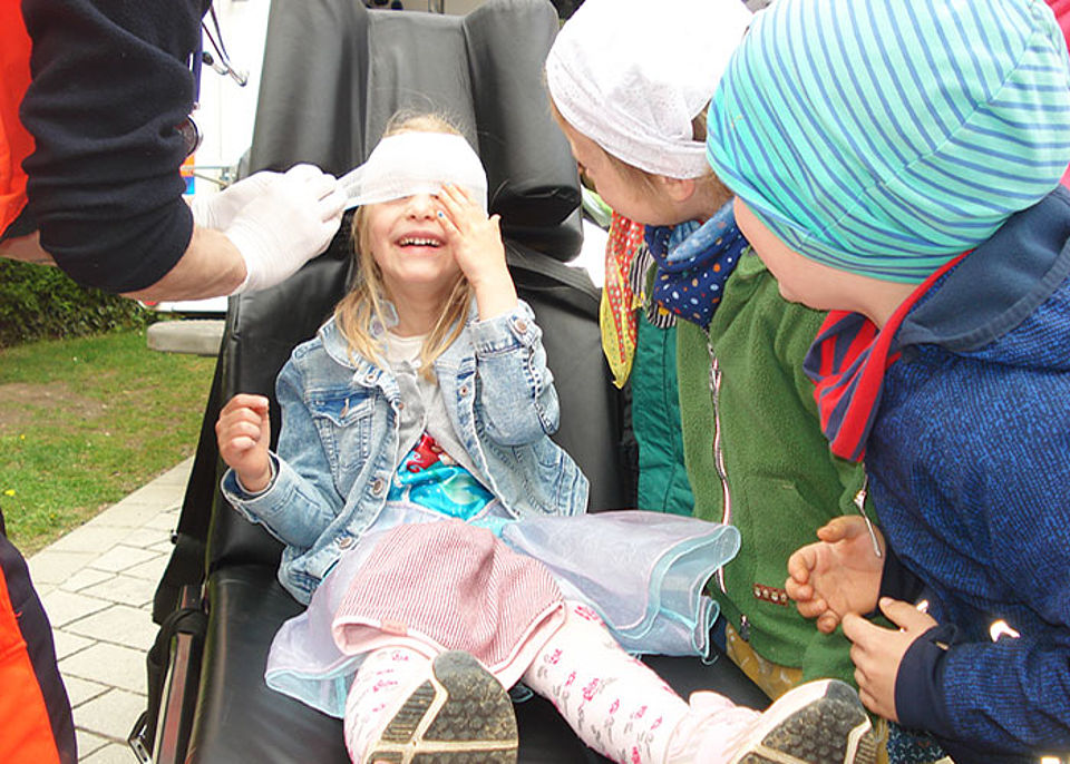 Die Arbeit von Rettungskräften ist eines von vielen interessanten Themen, die um den Rotkreuztag behandelt werden, da hier auf spielerische Weise schon den Kleinsten die Grundsätze der Ersten Hilfe vermittelt werden können. Dass dabei auch genau besprochen wird, wie man verhindern kann, selbst in Gefahr zu geraten und verletzt zu werden, gehört zum Konzept.