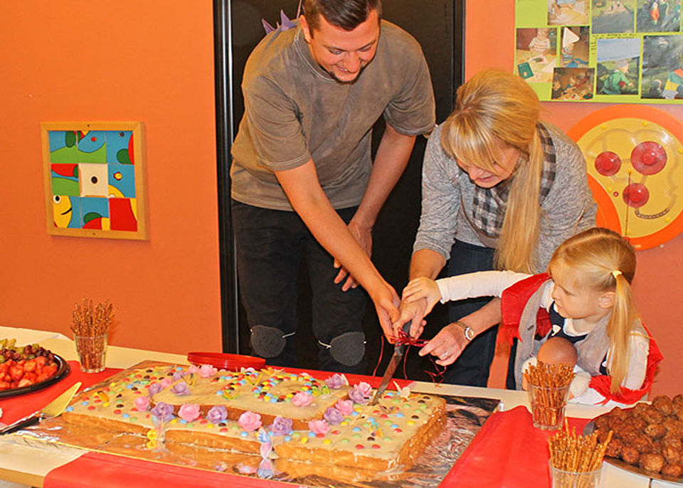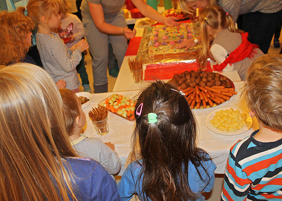 Und dann gab es auch noch eine zweite Überraschung - einen kunterbunten Geburtstagskuchen, der zur Freude der Kinder auch gleich angeschnitten wurde. Hmmm, lecker - und Happy Birthday!