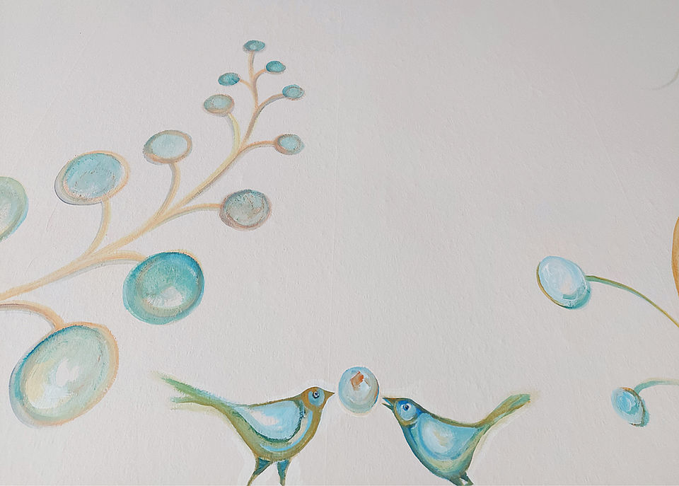 Das Bild zeigt Motive aus der Flora und Fauna. Gezielt wurden dafür Pastelltöne von der Künstlerin verwendet. Die linear grafische Arbeit passt sich der gegebenen Raumgestaltung an.