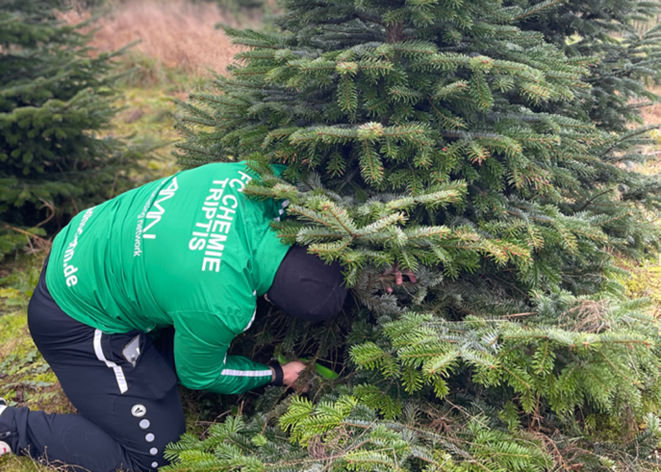 Die Sägeaktion wurde gleich weitergeführt, als drei Mitglieder des lokalen Fußballvereins Chemie Triptis ihre Schnelligkeit und Stärke demonstrierten. In nur drei Minuten sägten sie sechs Weihnachtsbäume auf der Plantage, die ebenfalls einem guten Zweck dienen sollen: Diese Bäume gehen an die Kindertageseinrichtungen und Seniorenheime unseres DRK-Kreisverbandes.
