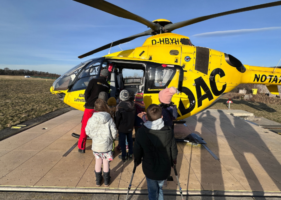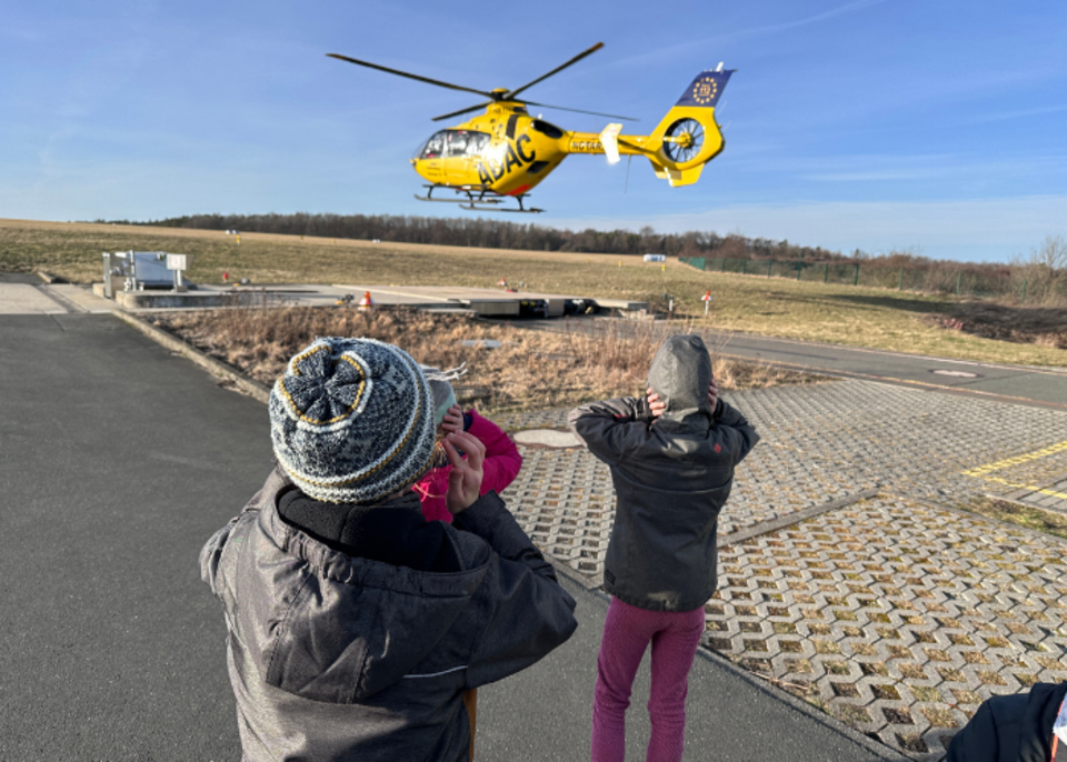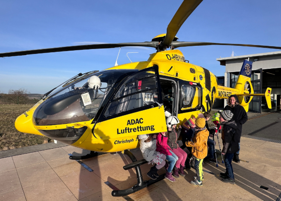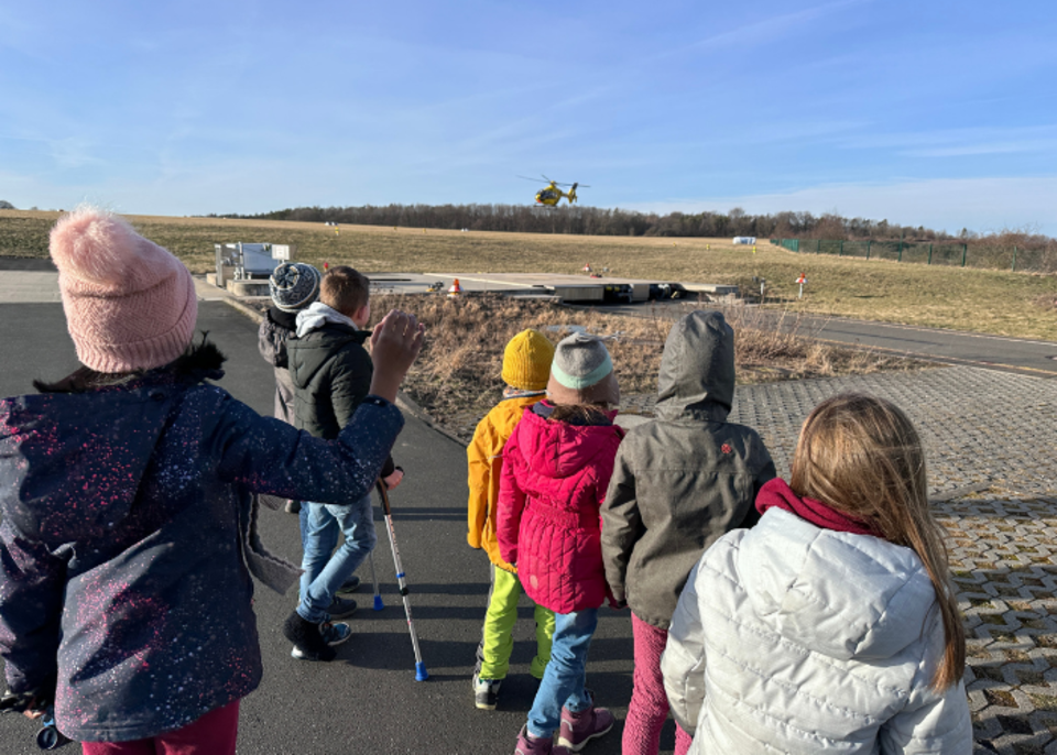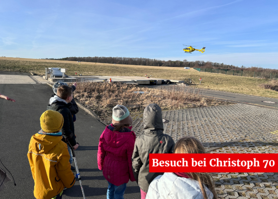 Am Montag, den 05.02.2024 war die AG Schulsanitätstdienst unserer Ganztagsgrundschule Dualingo zu Gast beim Rettungshubschrauber "Christoph 70" auf dem Flugplatz Schöngleina. Die Kinder konnten sehen wie der Hubschrauber, vom Einsatz kommend, landete. Durch Jens Weidhase wurden die vielen Fragen der AG-Kinder beantwortet und das Innenleben des Hubschraubers sowie die Aufgaben erklärt.