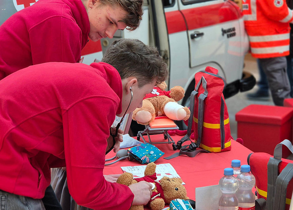 Ein besonderes Highlight für die jüngsten Gäste war die DRK‑Teddyrettung. Mit viel Einfühlungsvermögen erklärten die Helferinnen und Helfer, wie Erste Hilfe funktioniert – kindgerecht und spielerisch. Kuscheltiere wurden verarztet, Verbände angelegt und Ängste abgebaut. So lernten Kinder früh, dass Helfen keine Angst machen muss.