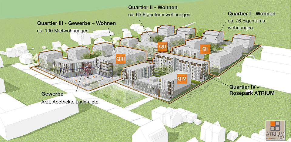 Das Quartier IV - Rosepark ATRIUM ist Teil des drei Hektar großen Wohngebietes "Atrium 105" und liegt im Jenaer Stadtteil Zwätzen, entlang der Naumburger Straße. Die Straßenbahnhaltestelle befindet sich in unmittelbarer Nähe. Auf Wunsch kann ein eigener Parkplatz angemietet werden.